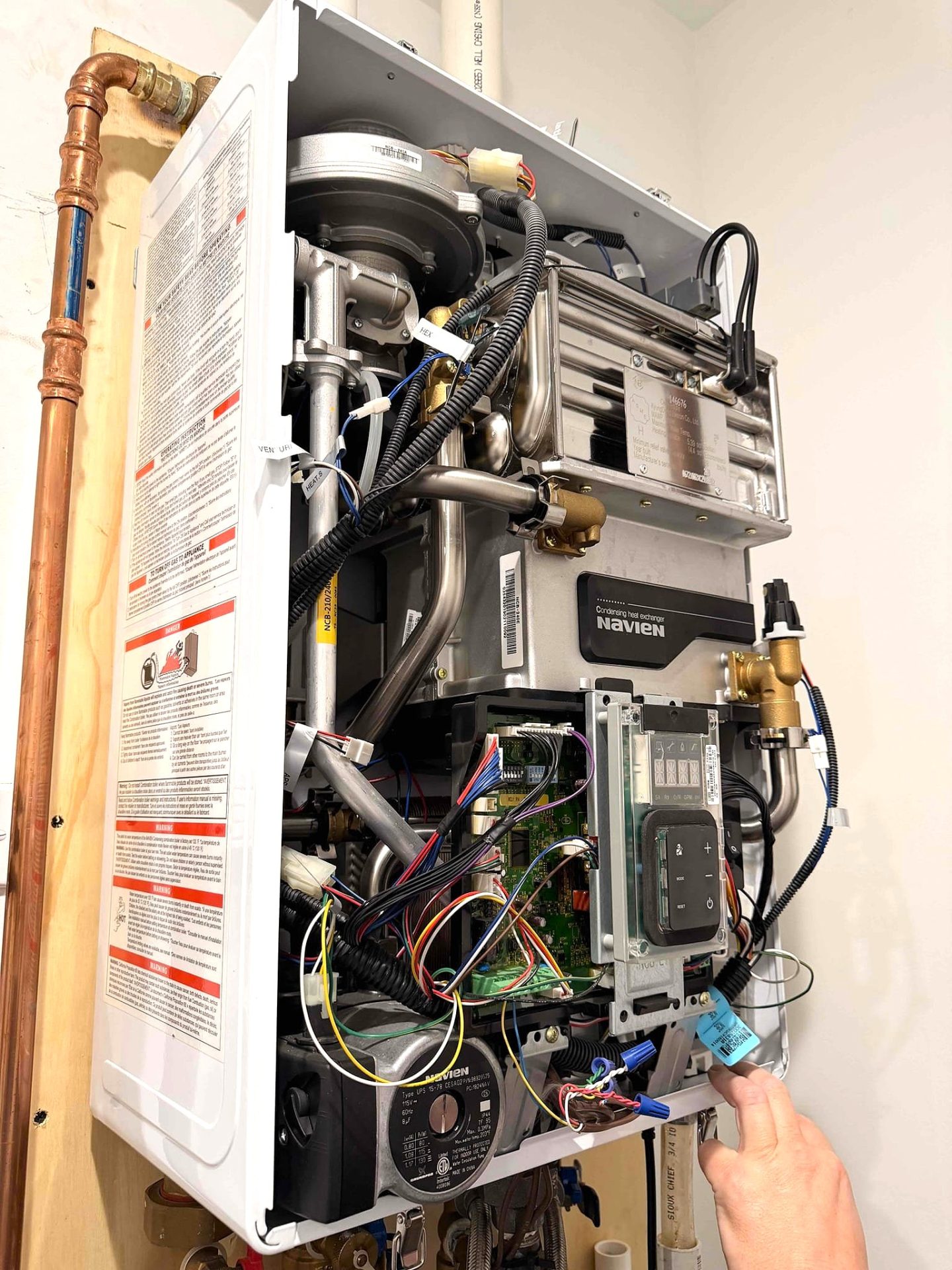 Next, we performed full maintenance on the Navien tankless water heater. We cleaned all internal screens and inlet filters to restore proper water flow. This step helps protect the unit from debris and buildup.